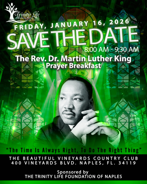 Dear Supporters, If you were not able to attend our 3rd Annual Rev. Dr. Martin Luther King, Jr. Prayer Breakfast held on Friday, January 14th, here's the video of the event. Enjoy! Want to get involved with Trinity Life Foundation of Naples as a mentor or supporter? E mail info@trinitylifefoundation.org.
